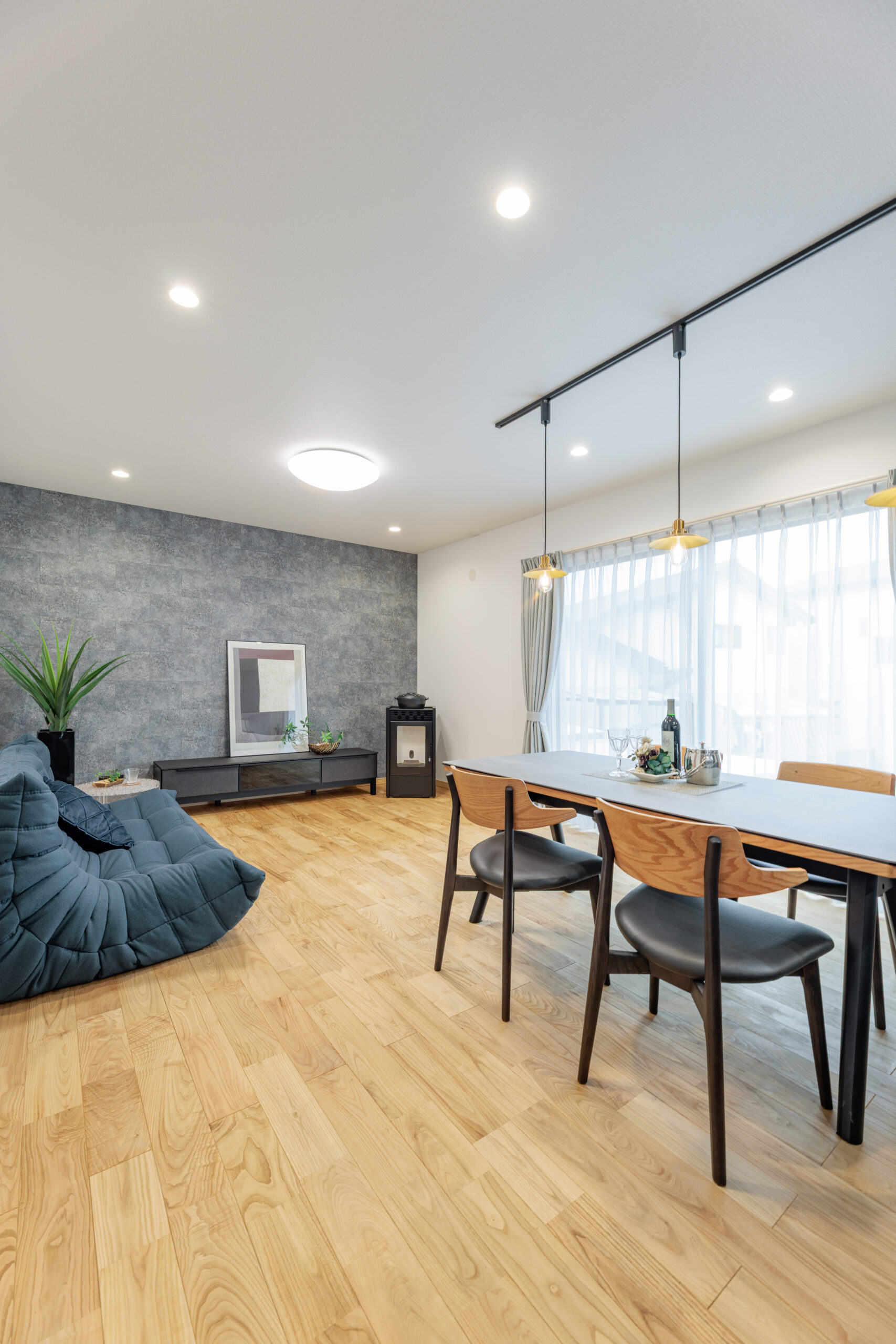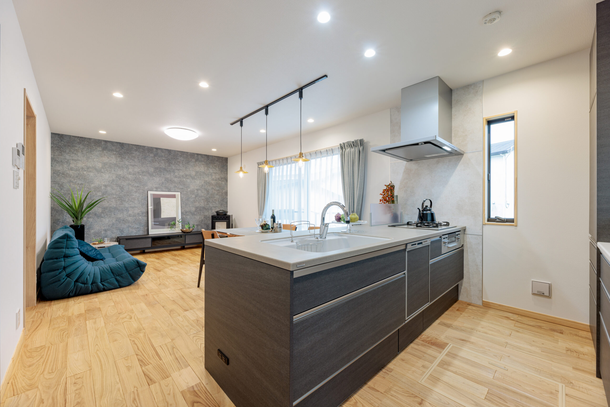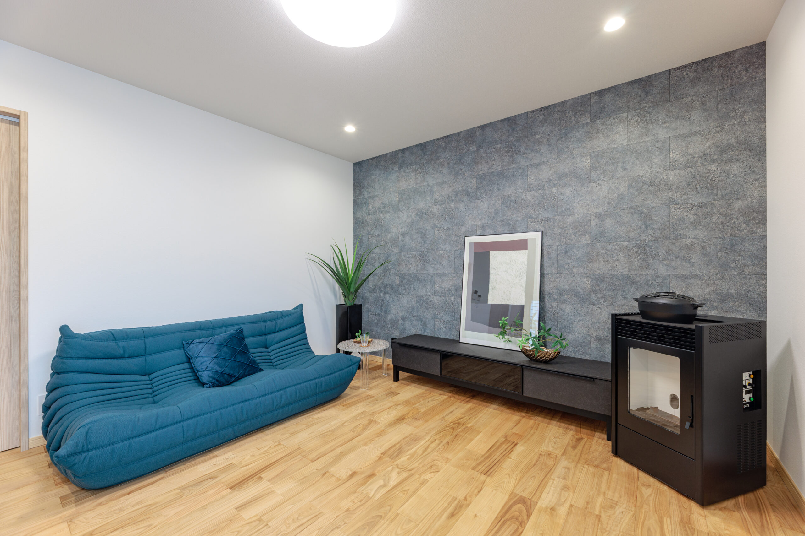 - ZEH水準省エネ住宅 一枚板手洗いカウンター ペレットストーブ 制震システム設置