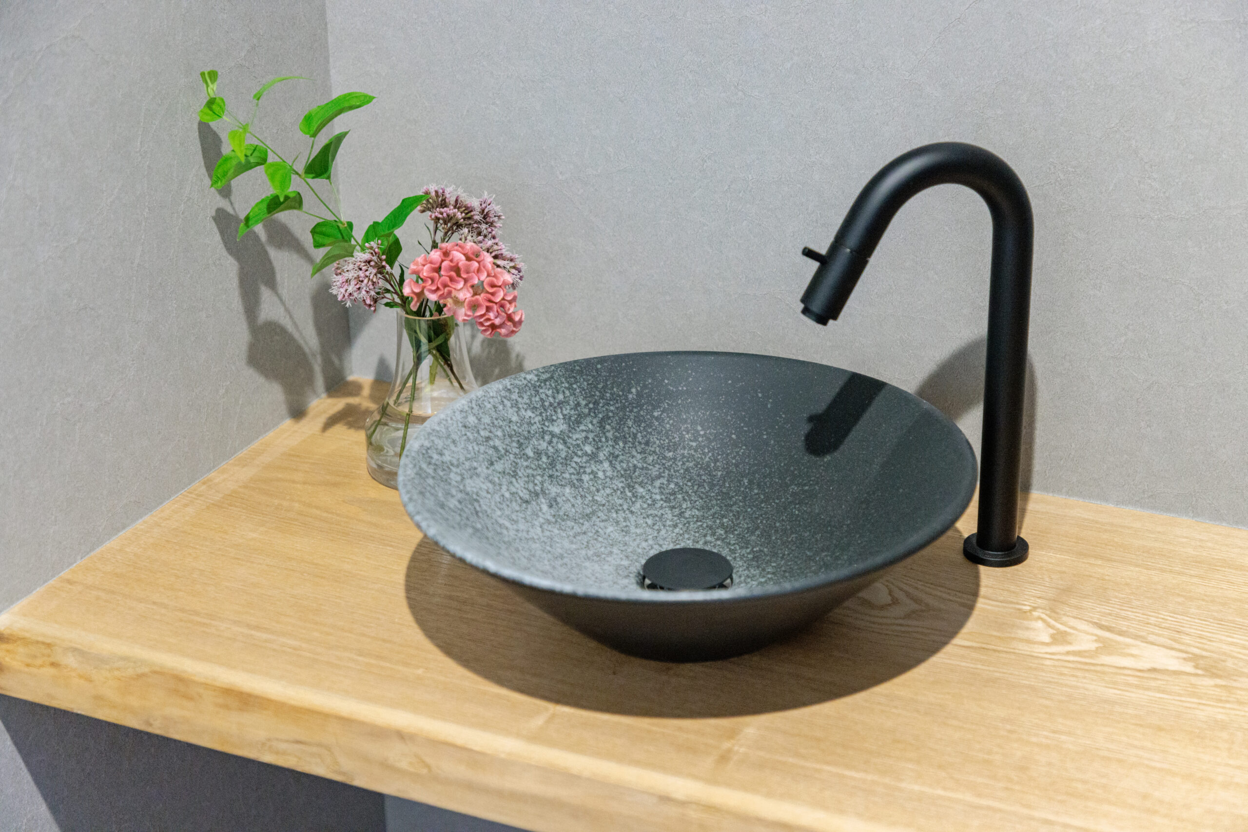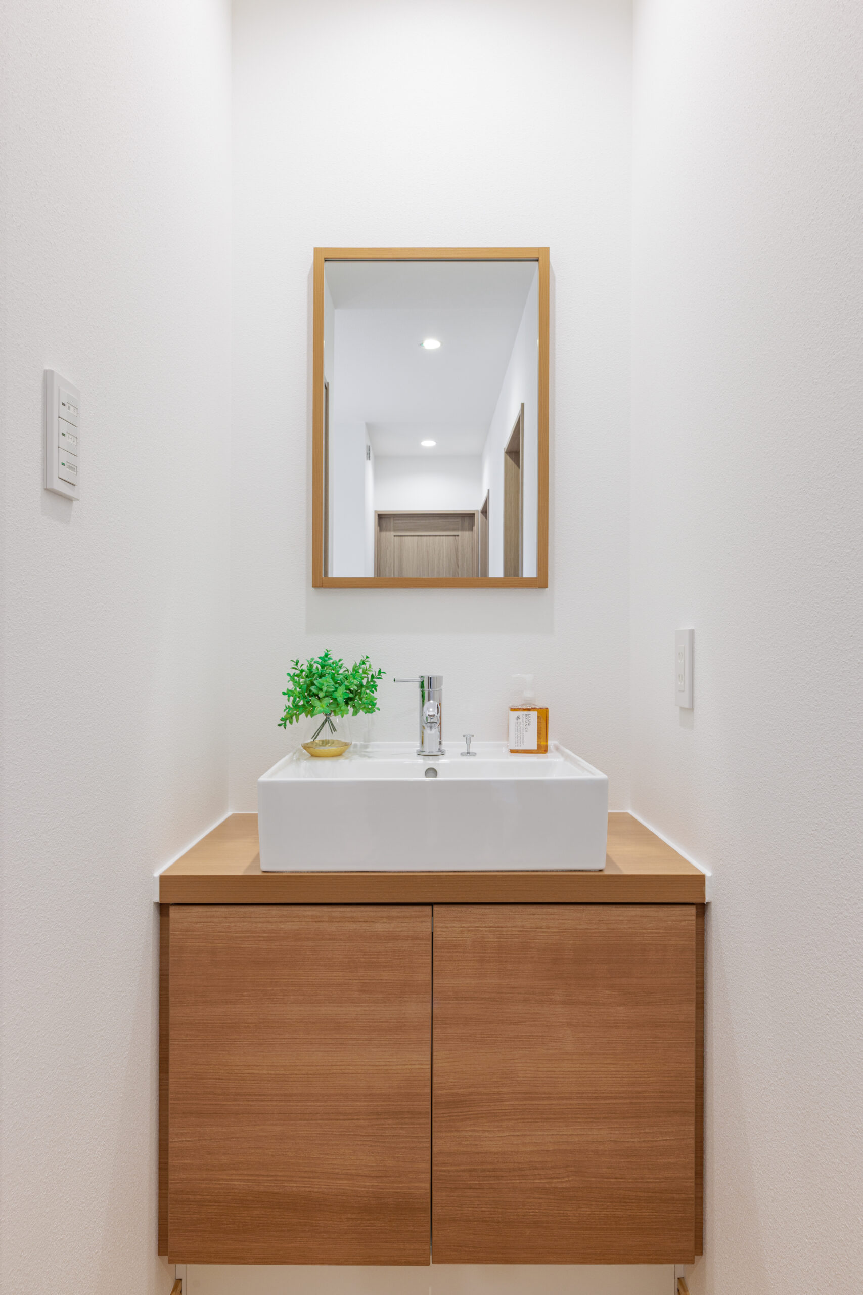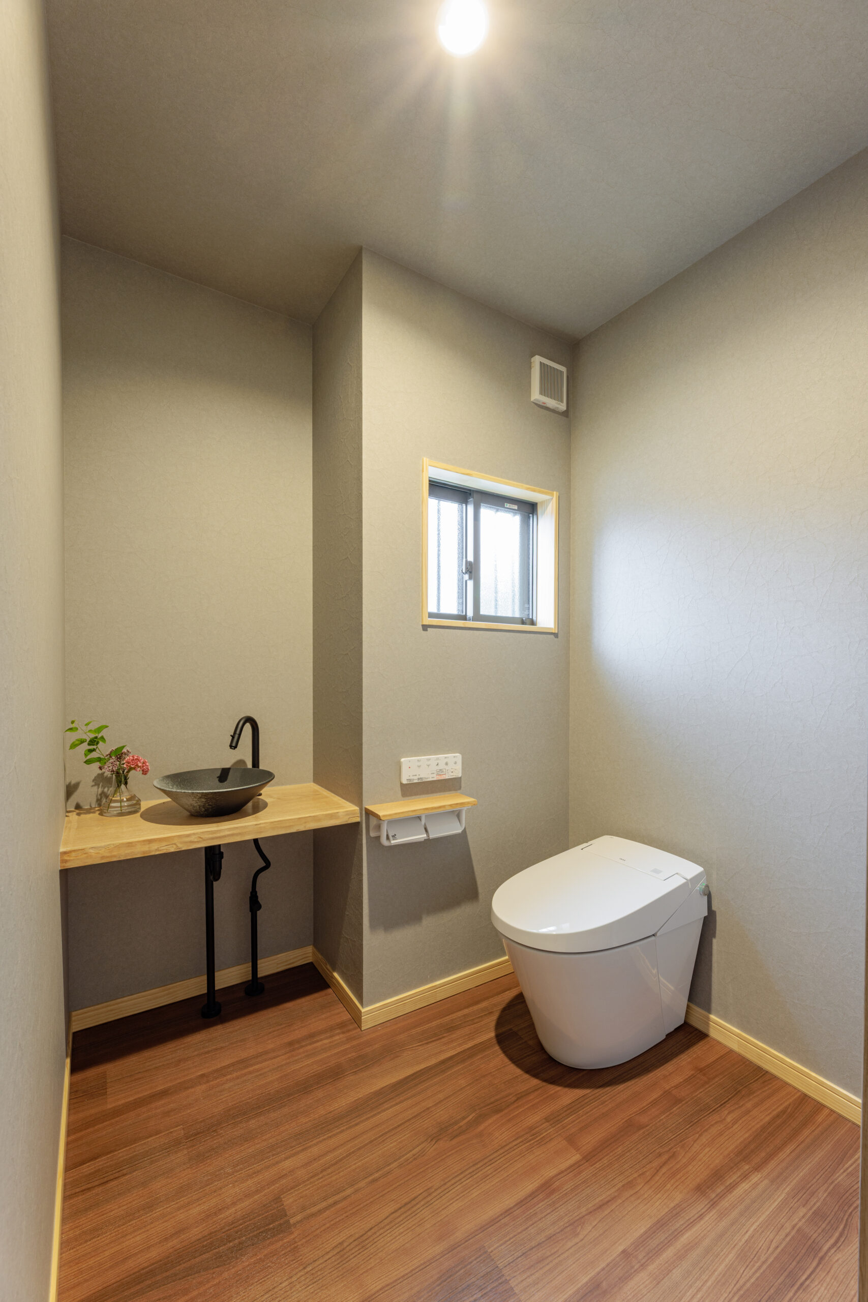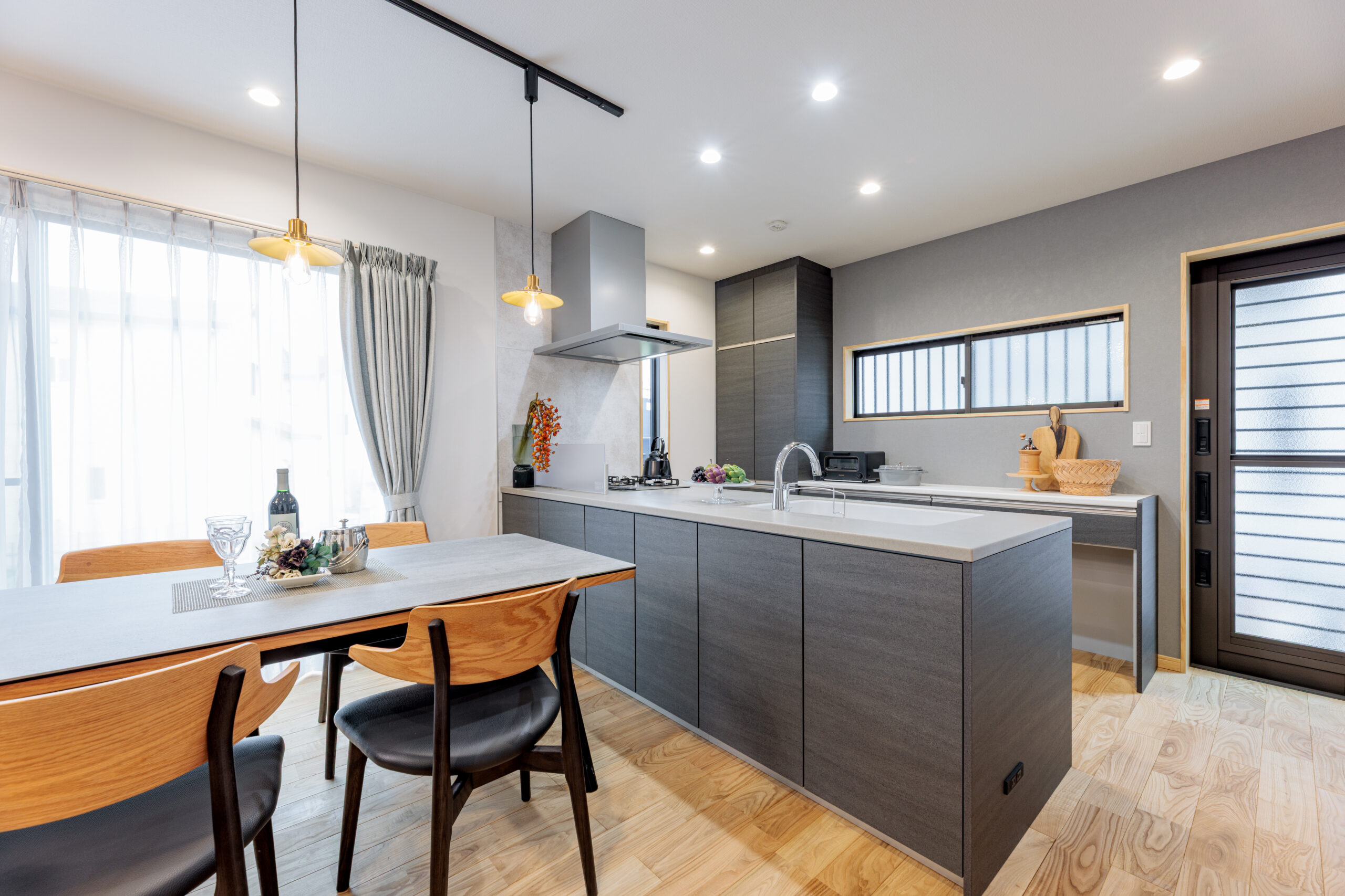 - ZEH水準省エネ住宅 一枚板手洗いカウンター ペレットストーブ 制震システム設置