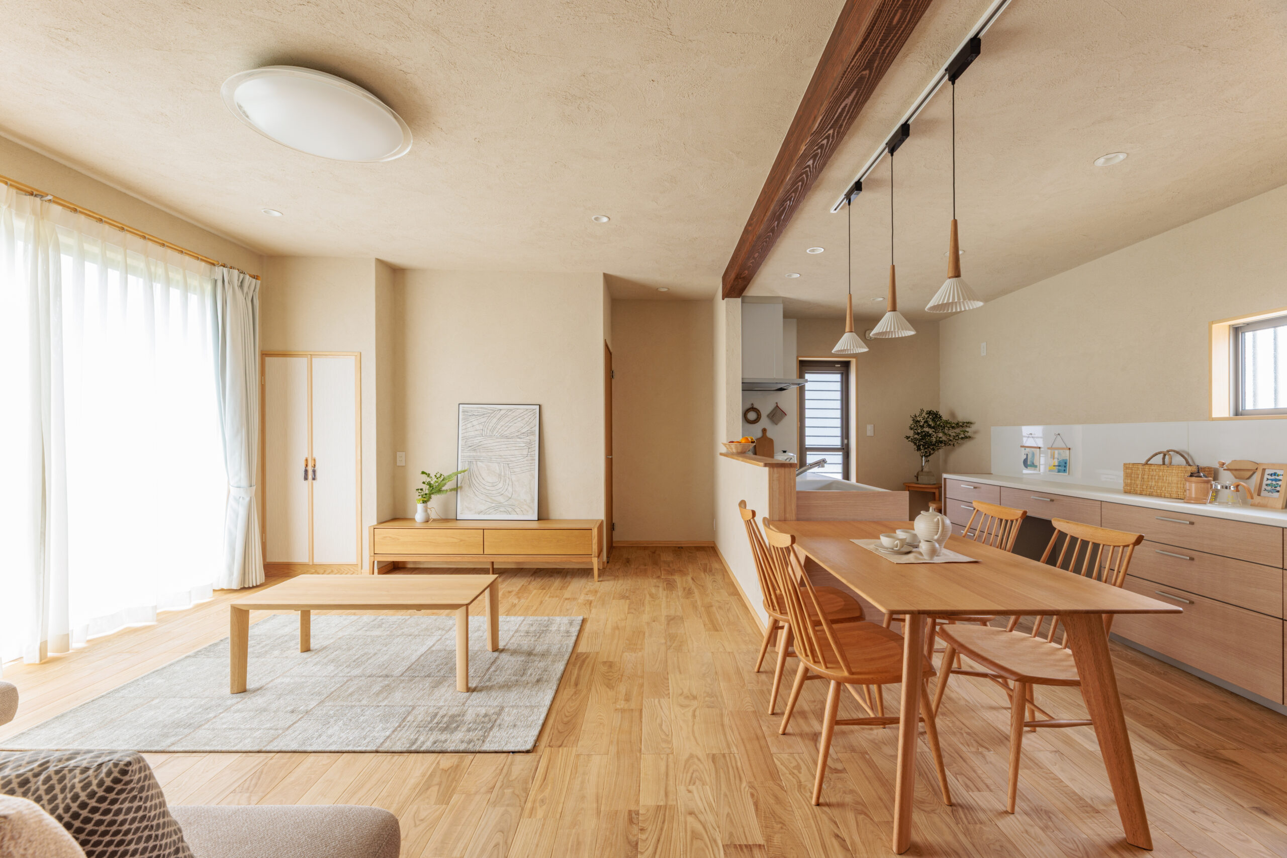 「無垢の床」「ケイソウ土の壁」「羊毛の断熱材」など木楽の自然素材を良くご理解いただき、土地のご相談から何年か打合せ少しづつ重ねて完成しました。